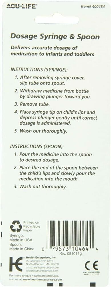 The Acu-Life Dosage Syringe And Spoon are designed for repeated use, making the set an environmentally friendly and cost-effective solution to medication administration needs.
