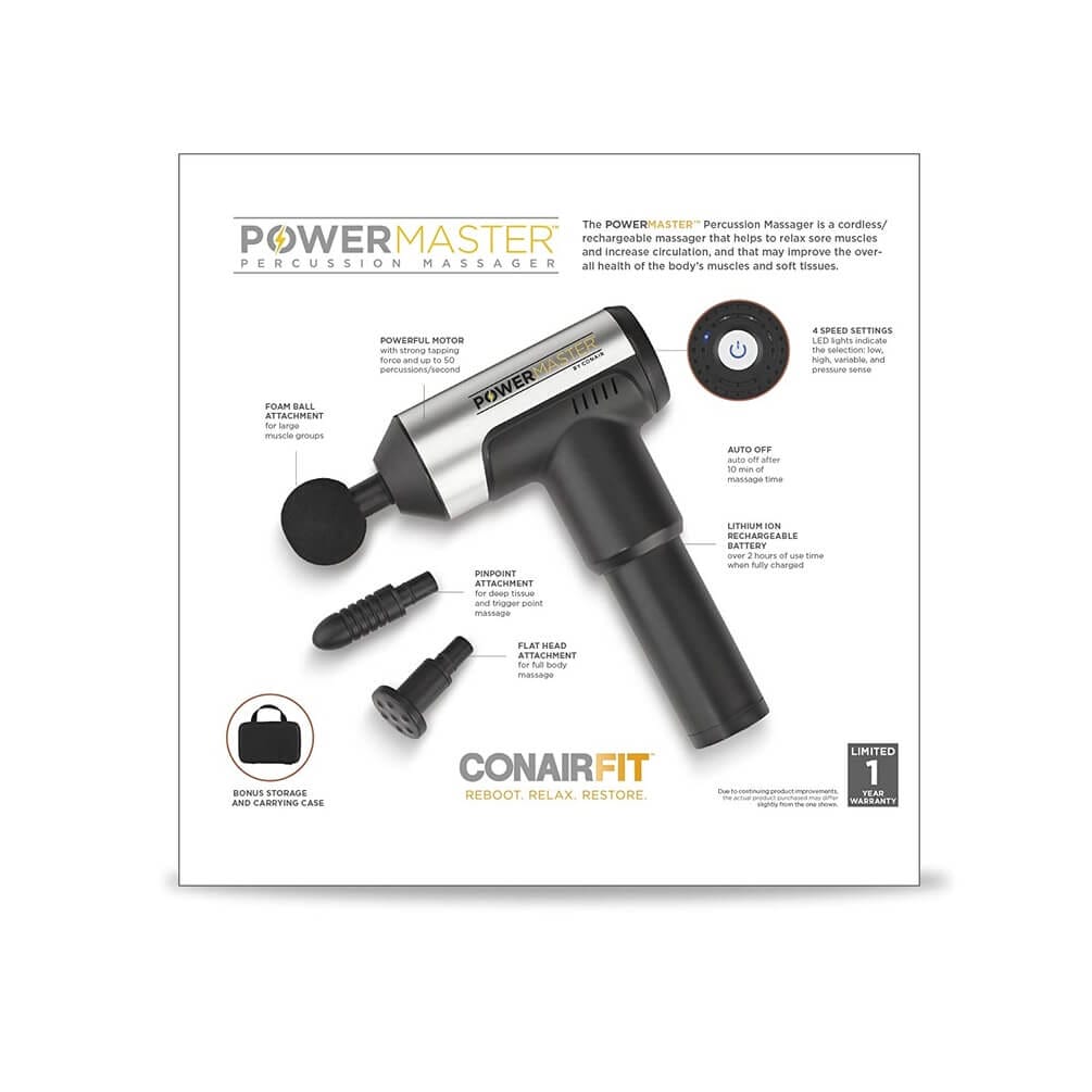 Enjoy a relaxing and invigorating deep massage in the comfort of your own home with the help of the Conair PowerMaster™ Percussion Massage Gun.