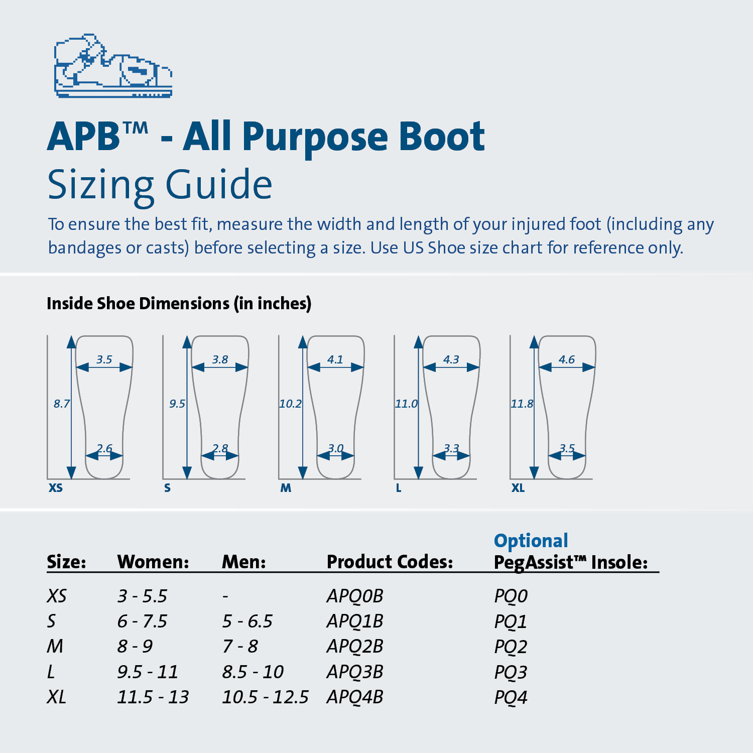 With the multilayer insole removed, the DARCO APB™ All Purpose Boot provides enough room for the DARCO’s innovative Peg Assist™ (PQ Series) off-loading insole. The boot is designed to be worn on either right or left foot and can be paired with your regular athletic shoe.