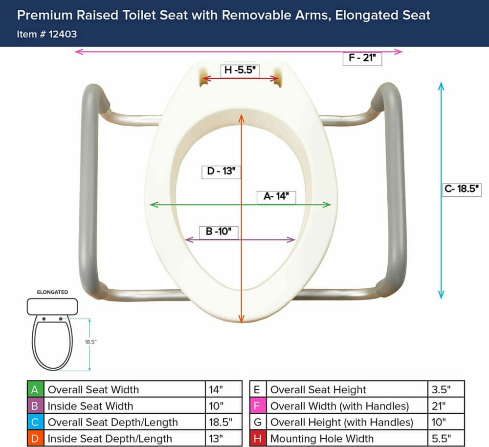 | Size | Toilet Seat Fit | Seat Dimensions | Seat Depth | Width Between Arms |