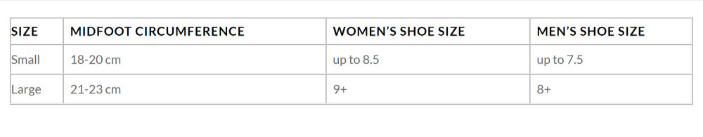 | Size | Midfoot Circumference | Women’s Shoe Size | Men’s Shoe Size |
