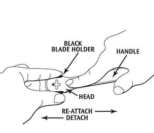 To remove the existing blade, slide the black blade holder down the handle. Replace the blade and reattach the holder by sliding it back up the handle.