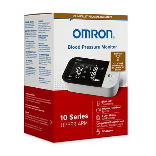 The OMRON 10 Series Wireless Upper Arm Blood Pressure Monitor can be used with the free OMRON Connect App for unlimited users, memory, graph, and trend tracking, and can be synced via Bluetooth. The app can be used with both android and iOS devices. It can also be used with Amazon-Alexa-enabled devices through the OMRON Health skill.